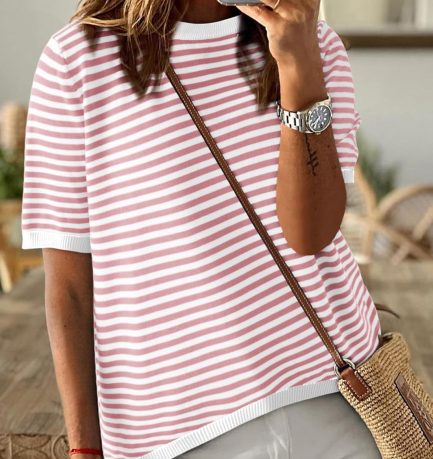 Women Tops Casual Summer Crewneck Short Sleeve Striped Color Block Knit High Low Trendy Pullover Sweaters