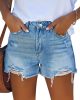 - Fashionably Distressed: These women’s high-rise denim shorts exude a trendy and fashion-forward look with their strategically placed distressed details, including stylishly placed holes and frayed edges, giving them a unique and edgy appeal.